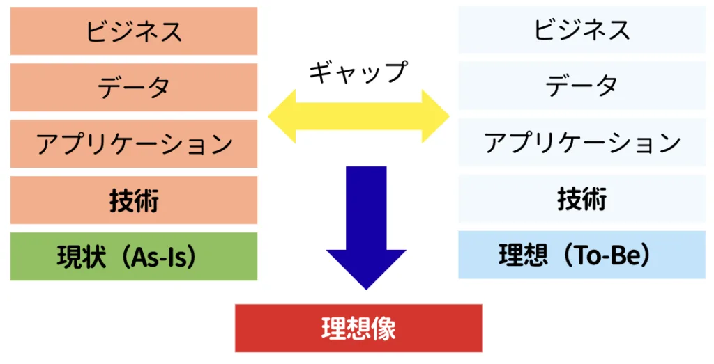 具体的には、まず組織全体の情報システムをビジネス・データ・アプリケーション・技術の4つの階層に分けて現状を把握し、目標とする理想像を設定します。